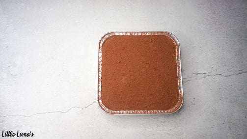 Made of ladyfingers dipped in coffee, layered with a special whipped filling flavored with cocoa.